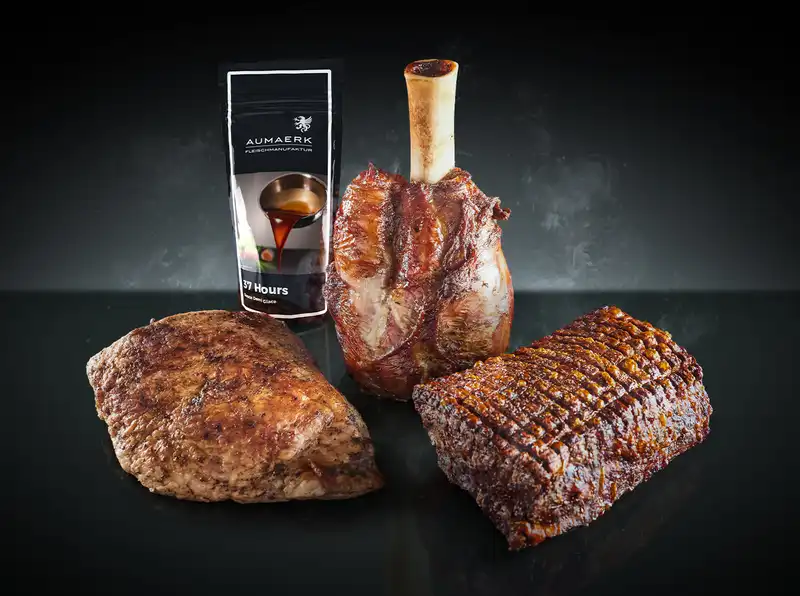 Hearty roast pork with a cracking crust, impressively tender veal shank - customers say that just twisting out the bone is fun - and boiled filet of veal, finely texured and lean with a mild, delicate flavour: The ideal arrangement for anyone who wants to experience the diversity of AUMAERK.