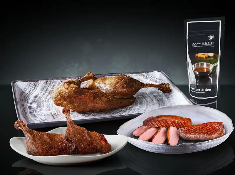 Genießen Sie den unvergleichlichen Geschmack unserer edlen Entenspezialitäten ganz einfach und gelingsicher und erleben Sie den vollendeten Genuss! Alle Produkte sind frei von Zusatz- und Konservierungsstoffen. Zusammen mit der fein abgestimmten „Twitter Juice“ Geflügelsauce (350 ml) erleben Sie kulinarische Höhepunkte.