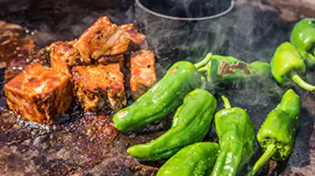 Gegrillte Schopfbratensteaks dürfen bei keiner Gartenparty fehlen. Schneiden Sie dazu den vorgegarten „Noble Roast“ in ca. 3 cm dicke Scheiben und rösten Sie sie von jeder Seite 2 Minuten am Grill. Fertig sind die perfekt zarten, aromatischen Schopfsteaks! Selbst gemachte Dips wie die würzige Romesco Sauce oder die leicht scharfe Salsa Verde sind eine tolle Ergänzung zu den herzhaften Grillsteaks vom Schwein.