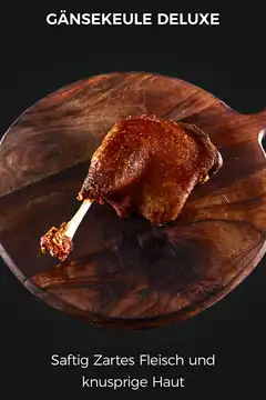 Der Duft der veredelten Gänsekeule nimmt die Nase sofort in Beschlag. Röstaromen und der markante Gänseduft vereinen sich zu einem olfaktorischen Glücksgefühl. Die ersten Bissen bestätigen die Vorahnung: Das Fleisch ist langfaserig, zart und saftig, mürb und doch etwas elastisch. Die Röstaromen der knusprigen Haut treffen aus salzmilde Töne, vitalisierende Pfeffernoten und würzige Anklänge bis zum Knochen hin und verbinden sich mit dem Gänsegeschmack zu einer perfekten Symbiose. Die unvergleichlich schmeichelnde Fleischstruktur verwöhnt den Gaumen auf exzellente Art.
