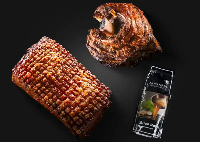 Feinst gewürzt, liebevoll veredelt und vorgegart kommen die Premium-Spezialitäten vom handverlesenen Qualitäts-Schweinefleisch gut gekühlt mit 24-h-Versand zu Ihnen. Wir bereiten die Braten in unserer Fleischmanufaktur so vor, dass die Flüssigkeit in jeder einzelnen Fleischfaser erhalten bleibt. Die spezielle patentierte AUMAERK-Veredelung macht’s aus, dass Ihnen zuhause in kürzester Zubereitungszeit immer perfekter Schweinebraten und Eisbein gelingen. Saftiges Fleisch, das sprichwörtlich auf der Zunge zergeht und dennoch genug Biss hat. Nicht zur vergessen: Die Kruste als goldbrauner, knuspriger Höhepunkt! Zeit zum Crunchen!