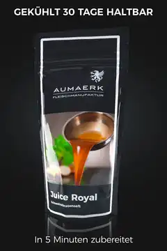 Überzeugen Sie sich vom perfekten Geschmack und der samtigen Konsistenz unserer hausgemachten Bratensoße. Fügen Sie die "Juice Royal" gleich Ihrer Fleischbestellung hinzu und proftieren Sie von einfachster Zubereitung, die Ihnen viel Zeit spart.