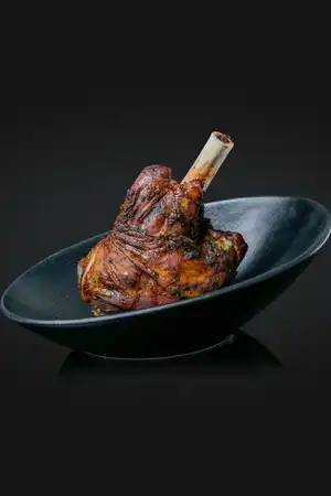 Das fertig gegarte Fleisch löst sich wie von selbst vom Knochen. Zart, saftig und butterweich offenbart dieses Edelstück eine perfekte Mischung aus Fleisch und Bindegewebe samt feiner Fetteinschlüsse, die der Lammstelze ihre unvergeichliche Charakteristik verleiht.