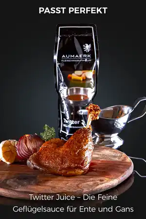 Nicht vergessen: Sauce zu Geflügel „Twitter Juice“ (350ml pro Stück) gleich im Warenkorb Ihrer Bestellung hinzufügen, zu Hause nur 5 Minuten aufköcheln und zu Gans & Ente genießen.